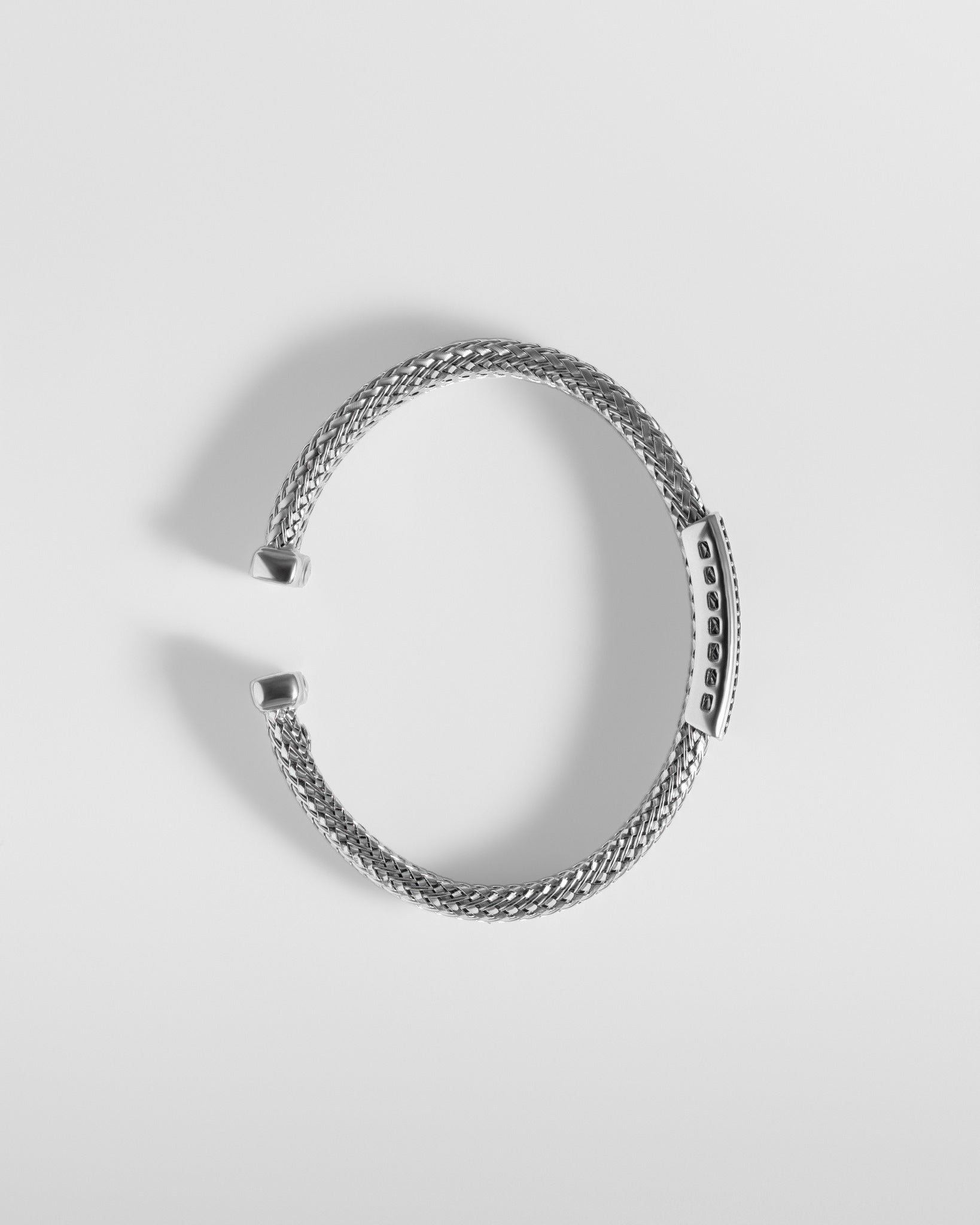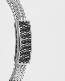 A bold interpretation of Italian elegance, this Gioia bracelet is crafted from Sterling Silver 925 and finished with a luminous rhodium plating for exceptional shine and durability. Its finely woven mesh structure delivers a sleek, architectural look, while the central accent—set with shimmering zirconia stones—adds a refined touch of contrast and brilliance.Designed as an open cuff, the bracelet offers effortless wear and a comfortable fit, balancing strength with fluidity.